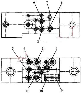(1.電磁閥 DT3 2.電磁閥 DT2 3.截止閥1 4.截止閥 3 5.截止閥2 6.溢流閥 RV 7.測壓接頭 MP 8.截止閥 4 9.壓力開關 KP2 10.壓力開關 KP1 11.電磁閥 DT1)