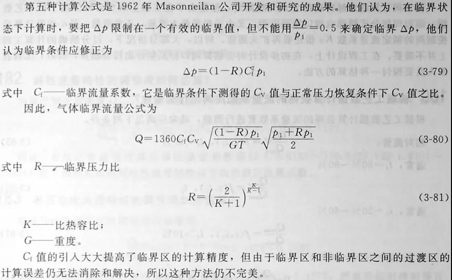 對(duì)流量系數(shù)公式的分析與比較關(guān)鍵在于對(duì)可壓縮流體公式的比較。從表3-5中看出不同計(jì)算公式的考慮因素各不相同,但畢竟都以原來的液體計(jì)算公式為基礎(chǔ)。可以把這些公式分成早期公式和近期公式兩大類型。在所列的8種公式中,前4種屬于早期,而后4種屬于近期。在早期的計(jì)算公式中,流量系數(shù)用CV或C表示,并用重度(ϒ )代替密度(ρ)計(jì)算。因此,使用和理解這些公式都要注意它的單位。