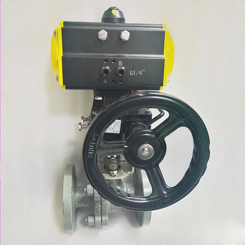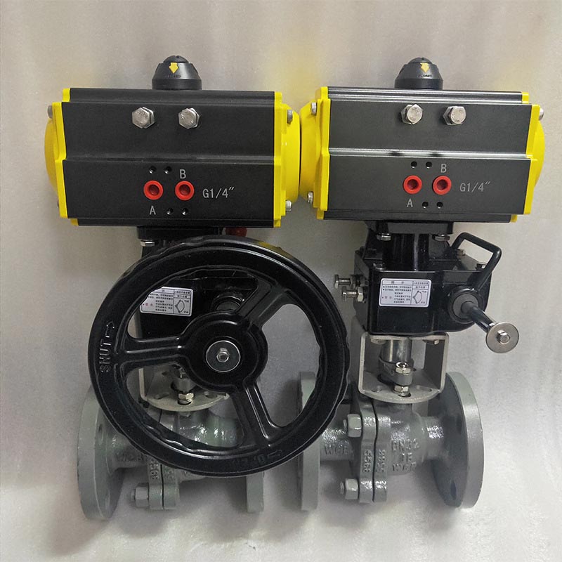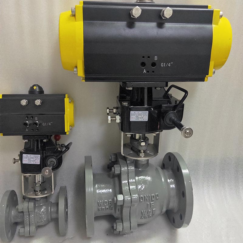 系列GT型氣動執行器,有雙作用式和單作用式(彈簧復位),齒輪齒條傳動,可靠;大口徑閥門采用系列AW型氣動執行器拔叉式傳動,結構合理,輸出扭矩大,有雙作用式和單作用式。
