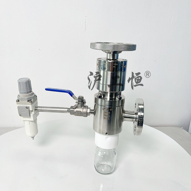 罐底取樣閥-帶反吹掃-配PFA取樣瓶,解決了現有取樣閥的復雜結構,取樣瓶采用PFA材質,可取樣為腐蝕性介質,罐底取樣閥-帶反吹掃配PFA取樣瓶主要有閥體、閥芯、閥桿、閥座、密閉針、帶膜片取樣瓶組成,取樣瓶為可拆卸設計,試樣從入料針進入取樣瓶內,并通過排氣針排出壓力,使取樣瓶保持在常壓狀態,取樣瓶品裝有橡膠膜可將取樣瓶密封,避免污染試樣,流道無流阻設計,不影響流量,閥桿通過手柄、電動執行機構、氣動執行機構旋轉帶動閥桿及閥芯,閥芯上下提拉,可精確控制流量,實現試樣進入取樣瓶內,取樣瓶可選透明和避光兩種,本取樣閥廣泛應用在制藥、化工、食品行業。