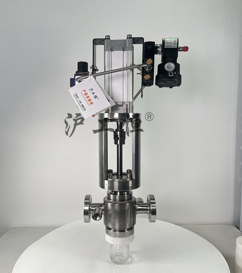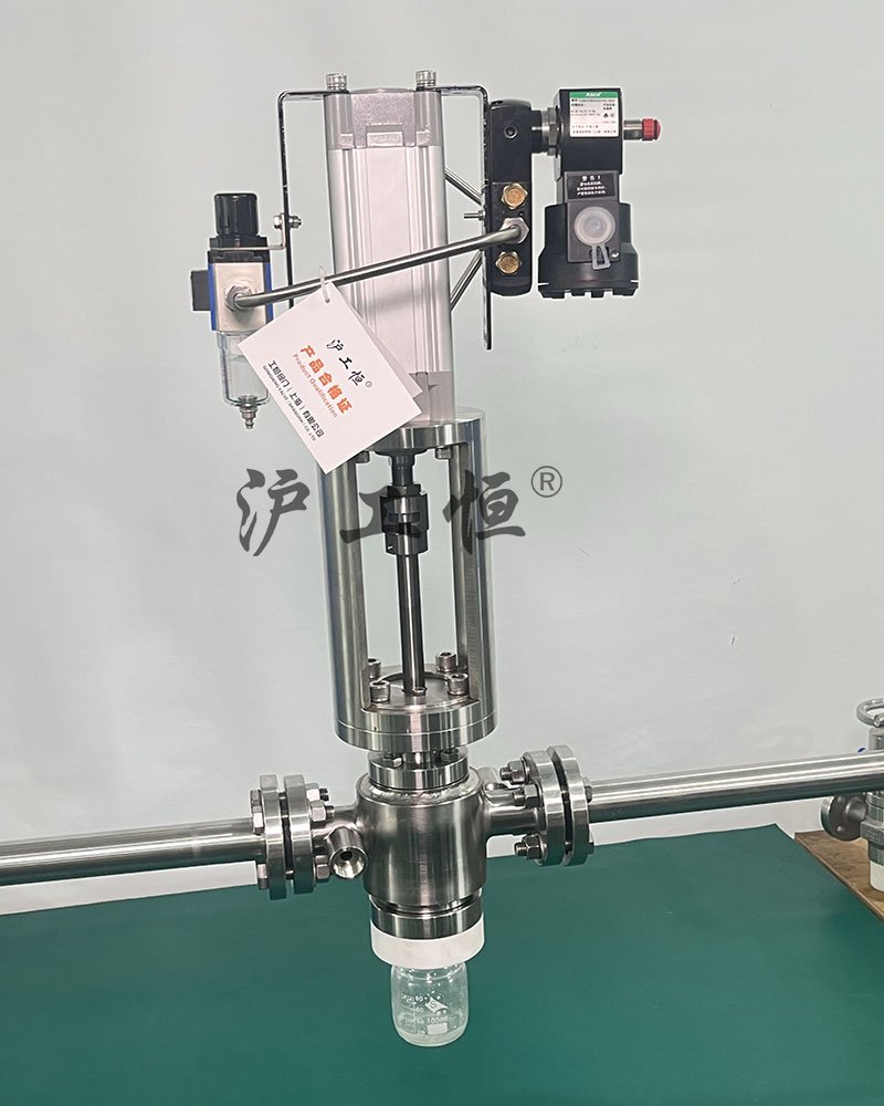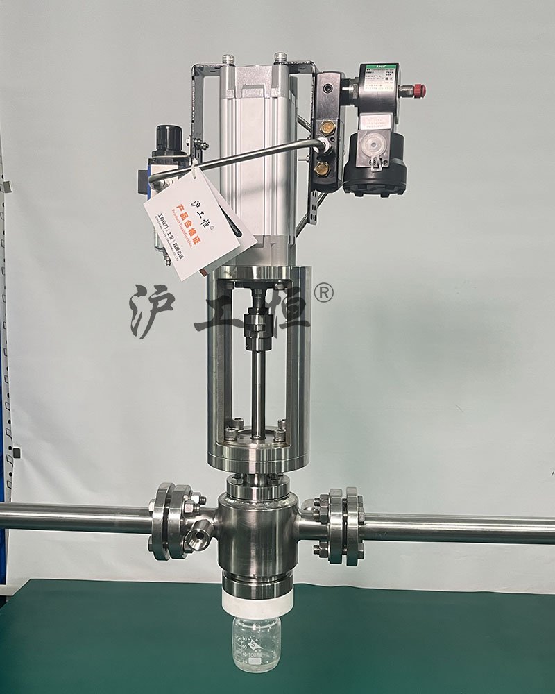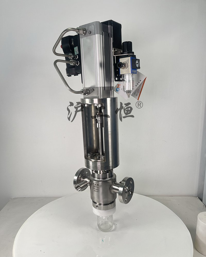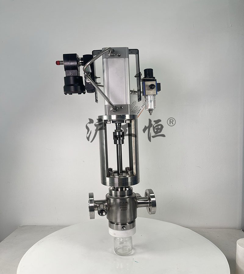 氣動柱塞式定量取樣閥,解決了現有取樣閥的復雜結構,取樣瓶采用PFA材質,可取樣為腐蝕性介質,氣動柱塞式定量取樣閥主要有閥體、閥芯、閥桿、閥座、密閉針、帶膜片取樣瓶組成,取樣瓶為可拆卸設計,試樣從入料針進入取樣瓶內,并通過排氣針排出壓力,使取樣瓶保持在常壓狀態,取樣瓶品裝有橡膠膜可將取樣瓶密封,避免污染試樣,流道無流阻設計,不影響流量,閥桿通過手柄、電動執行機構、氣動執行機構旋轉帶動閥桿及閥芯,閥芯上下提拉,可精確控制流量,實現試樣進入取樣瓶內,取樣瓶可選透明和避光兩種,本取樣閥廣泛應用在制藥、化工、食品行業。