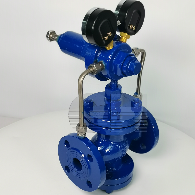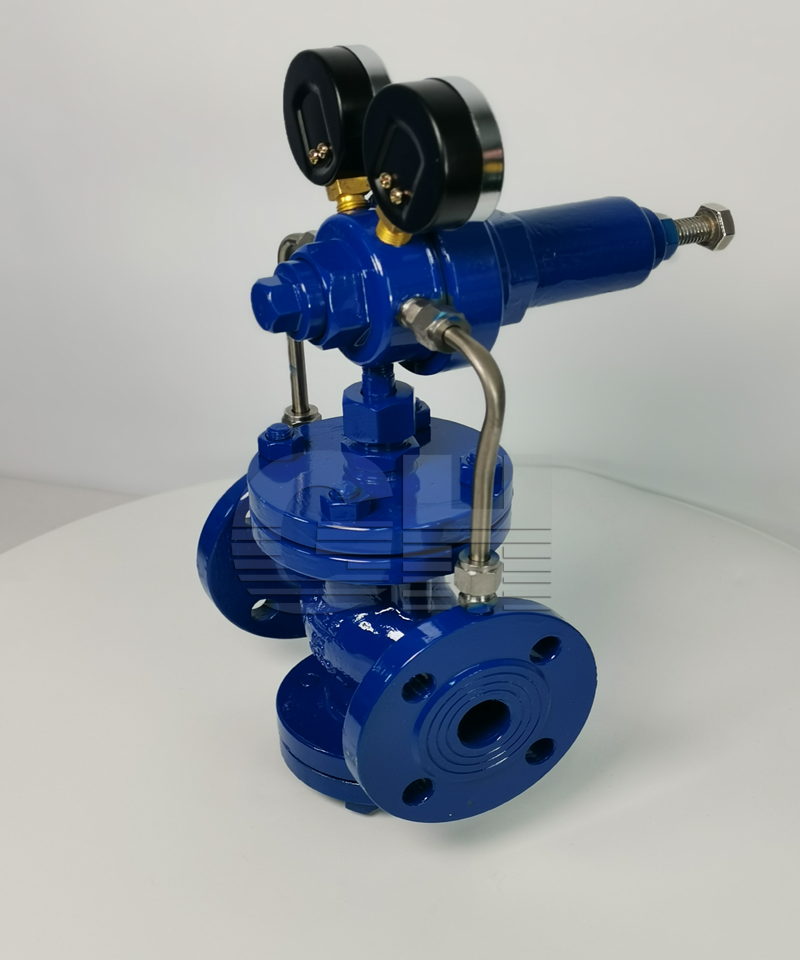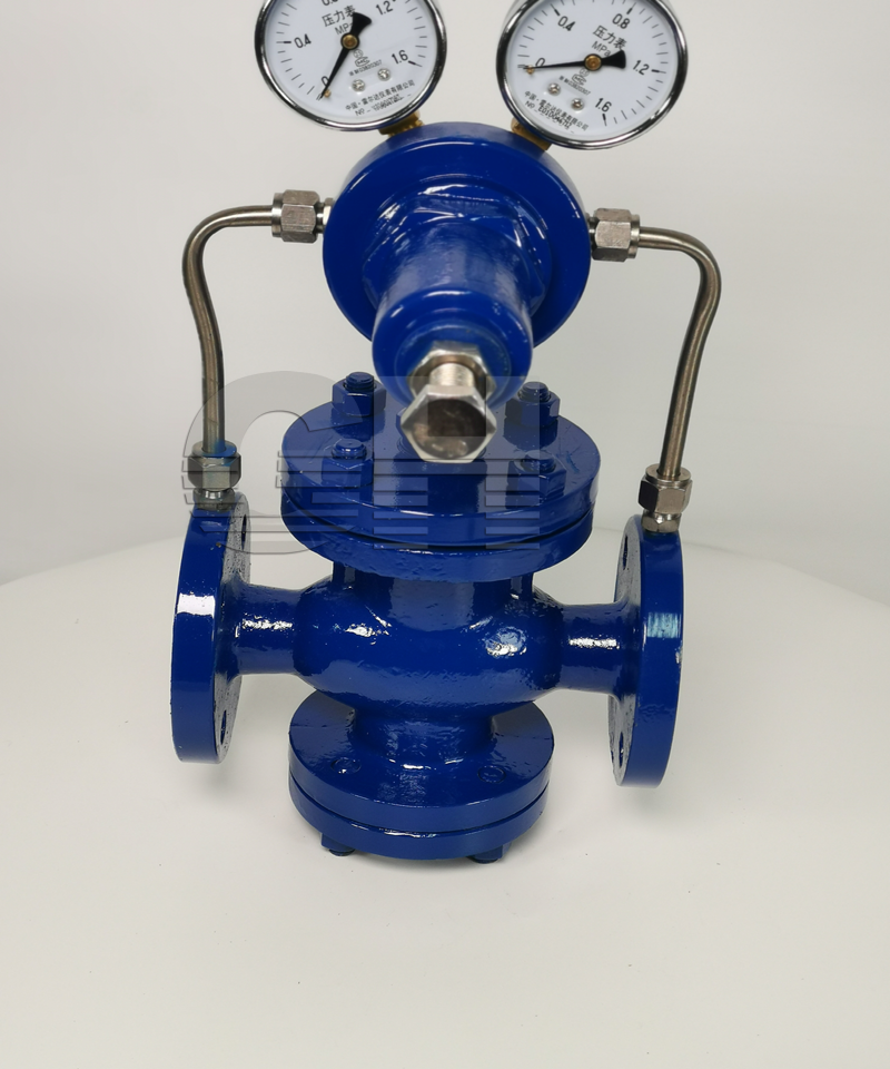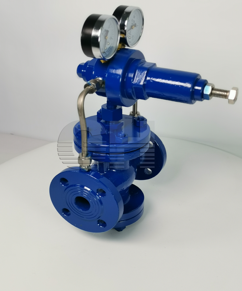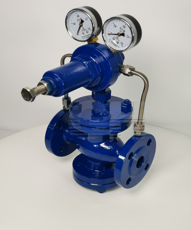 壓縮空氣減壓閥通過調節調節彈簧壓力設定出口壓力、利用膜片傳感出口壓力變化,通過導閥啟閉驅動活塞調節主閥節流部位過流面積的大小,實現減壓穩壓功能。