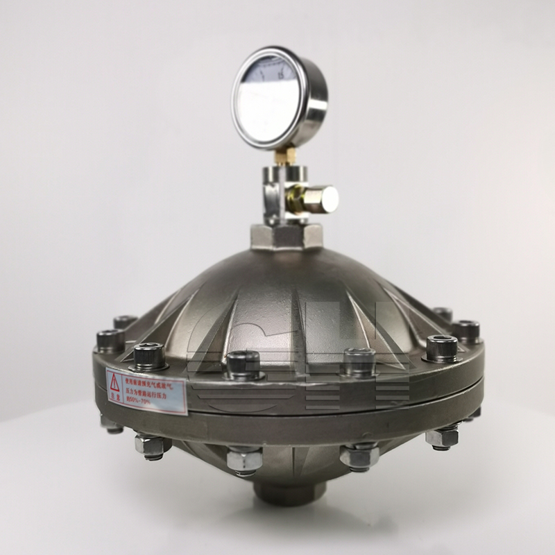 膜片式脈沖阻尼器分為上下殼體,中間由聚四氟乙烯&橡膠復合膜片分隔,是常用的脈沖阻尼器。 的***點就是隔膜將預充氣體和管路中的液體分開,方便維護,在合適的選型、充壓條件下,能夠減少 大多數的脈沖。我公司生產的膜片式脈沖阻尼器PVC材質的 耐壓為1.0MPa,不銹鋼材質 耐壓一般為2.5MPa,耐壓5.0MPa。